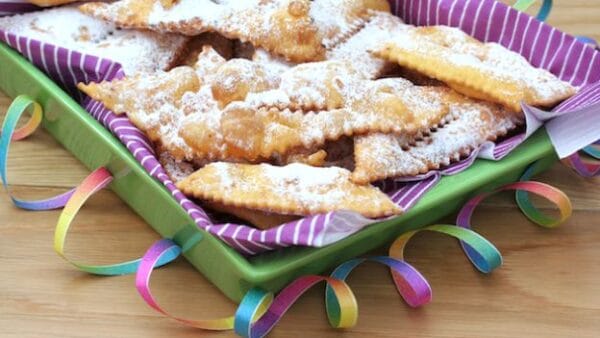 Una de las comidas típicas del Carnaval italiano es un producto dulce: son las llamadas “chiacchiere”. En las diferentes regiones italianas se les llaman con otros nombres, por ejemplo “frappe”.